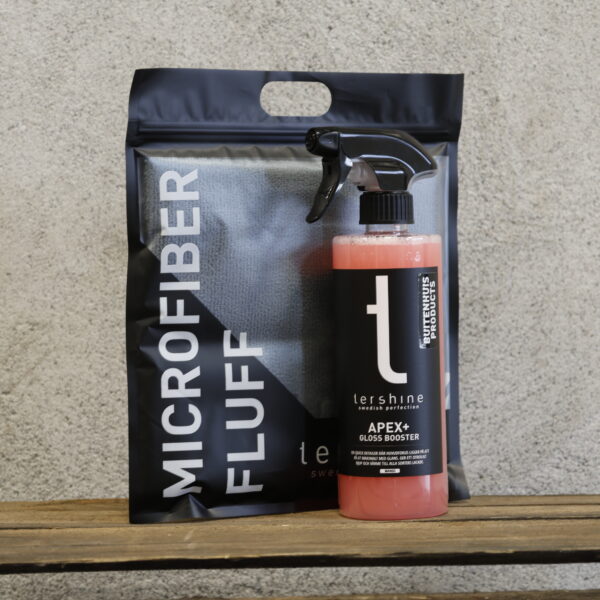 Breng de ultieme glans tot leven met de Apax+ Glossbooster & Fluff Microvezeldoek set — de perfecte duo voor iedereen die zijn auto die diepe, spiegelende glans wil geven.